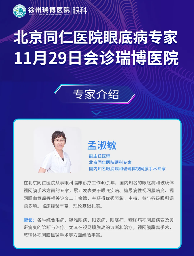 而本次来徐州瑞博会诊的专家孟淑敏主任则在北京同仁工作了40余年,对于眼底疾病临床经验相当丰富!如您有需求,赶紧拿起手机进行预约吧(预约电话:0516-87721999),机不可失,时不再来!!